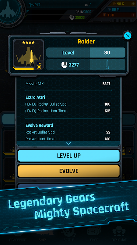 - Various Weapons: A spaceship can carry up to seven weapons and five defense gears. You do have a chance to customize your invincible aircraft with various weapons!