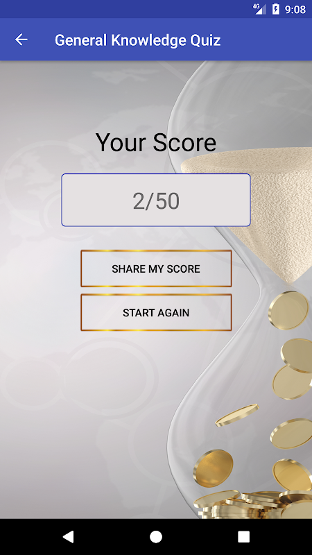 Test your general Knowledge by trying to answer 50 questions in 20 minutes , share the app with friends end share your score