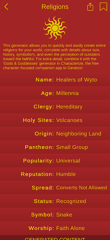 - چه در حال راه اندازی یک کمپین RPG، نوشتن یک حماسه یا توسعه بازی خود باشید، Genesis جرقه خلاقیت مورد نیاز را به شما می دهد.