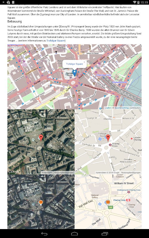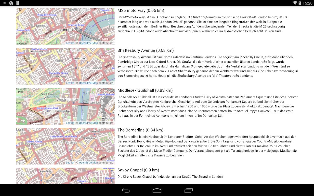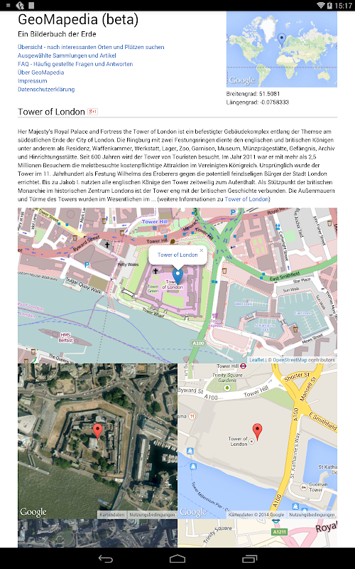 چه اطلاعاتی را می توانم پیدا کنم؟ برای هر ورودی به محل خواهد شد بر روی یک نقشه از جهان نشان داده شده است و نشان داده شده است عکس های هوایی و نقشه های خیابان. نقشه در نقشه های گوگل، بینگ نقشه ها و پروژه نقشه شهری باز (OSM) را می توان مستقیما مقایسه شده است. نقشه های گوگل باز هستند و لینک های تعاملی اشاره به مکان های که در این نزدیکی هست. در حال حاضر، GeoMapedia آلمانی زبان شامل بیش از 30000 مدخل است.