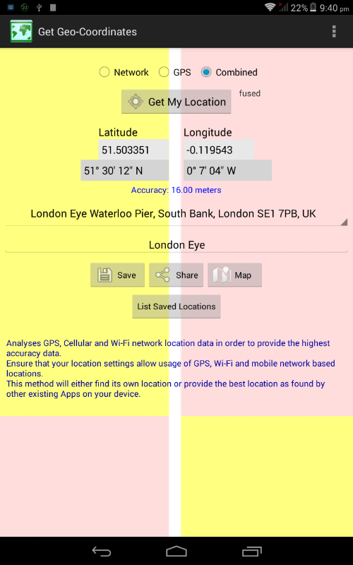 این برنامه مختصات جغرافیایی و طول جغرافیایی مکانی را که در آن با دستگاه خود قرار دارید ، در اعشار درجه و همچنین درجه-دقیقه-ثانیه به شما ارائه می دهد.