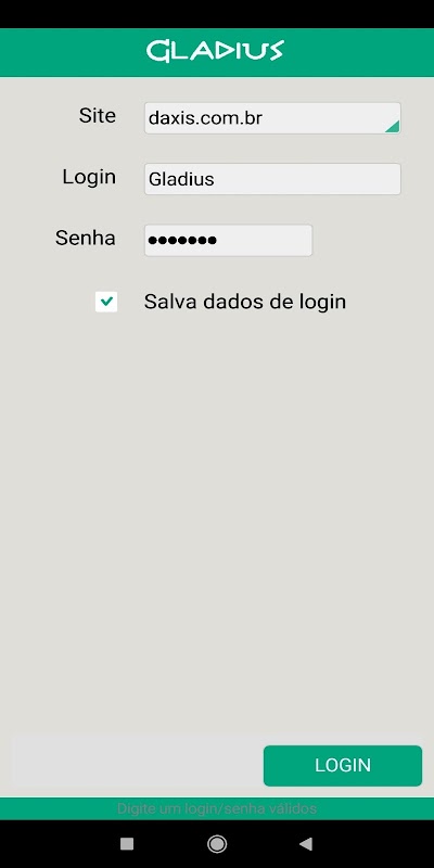 Você pode testar o aplicativo, em uma base-exemplo, mesmo sem ser usuário do sistema Gladius - basta usar as credenciais fornecidas abaixo: