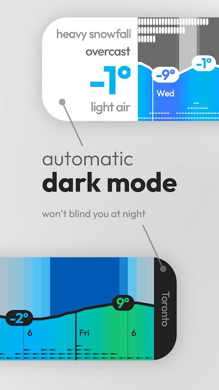 دما، بارش، باد و پوشش ابر را برای هر ساعت دریافت کنید - همه به صورت بصری برای درک سریع بدون یک ضربه نمایش داده می شوند.
