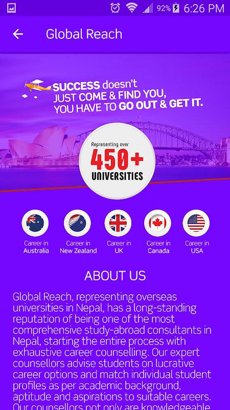 Global Reach, set-up in 1991, pioneered the concept of educational counseling in Eastern India and currently manages the marketing and representation of over 350 accredited foreign universities and educational institutions world wide.