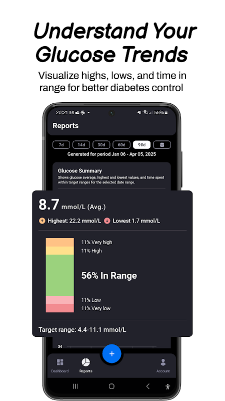 گلوکز، انسولین، کربوهیدرات، وزن و HbA1c را دنبال کنید. گزارش ها را دریافت کنید و کنترل خود را حفظ کنید