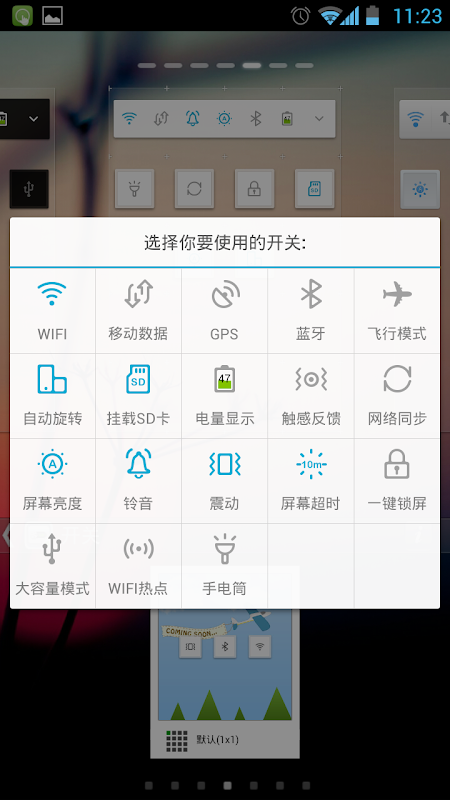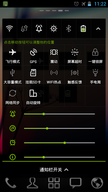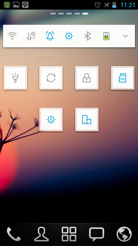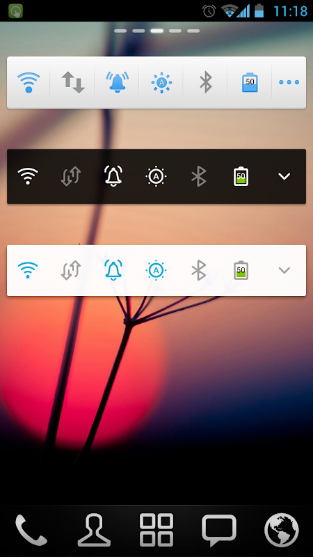 - فای، رینگر، روشنایی، بلوتوث، MobileNetwork، GPS، همگامسازی خودکار، حالت هواپیما، چرخش اتوماتیک، ارتعاش، ScreenTimeout، قفل صفحه، حجم رینگر، حجم رسانه ها