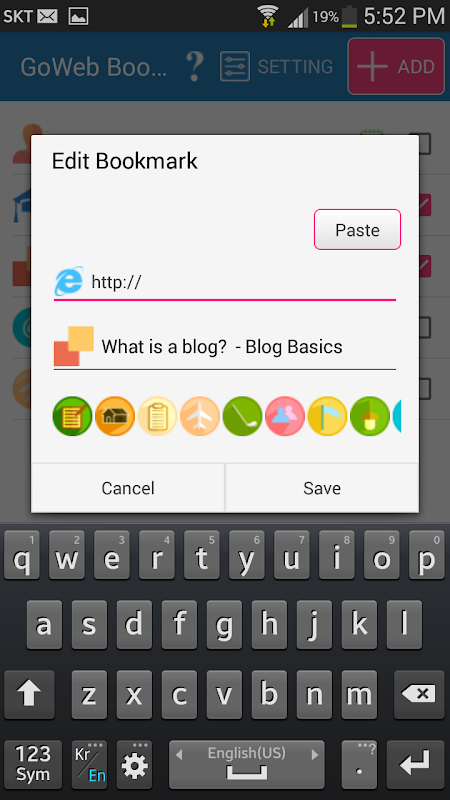 آدرس وب را می توان به طور مستقیم از روی صفحه نمایش تنظیم اضافه شده است. یا، اگر شما با یک بوک مارک GoWeb در برنامه دیگری به اشتراک بگذارید، آدرس وب سایت شما کپی خواهد شد