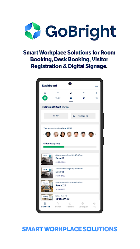 برنامه GoBright بخشی از سیستم عامل GoBright مبتنی بر ابر است. GoBright راه حل های نرم افزاری هوشمندی برای مدیریت اتاق ، میز و بازدیدکنندگان در دفتر ارائه می دهد که کاملاً در کنار هم قرار می گیرند و استفاده از آنها آسان است. از طریق برنامه یک اتاق جلسه ، میز یا کمد در دسترس پیدا کنید. آن را در چند ثانیه رزرو کنید و از محل کار متناسب با نیازهای خود مطمئن باشید. تحریک و کار مبتنی بر فعالیت را تحریک می کند.