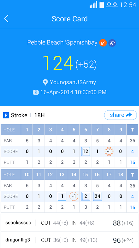 رکورد دور خود را با دوستان خود را با اقدامات مختلف مانند نمره متوسط، فاصله پرواز، نرخ ضربه fairway در و غیره مقایسه کنید.
