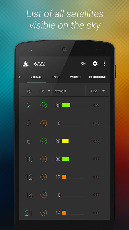 2) زبانه سیگنال - لیست تمام ماهواره های متصل به دستگاه. هر ردیف نشان دهنده یک ماهواره است. شما تمام جزئیات مربوط به شماره prn ماهواره ، اطلاعات مربوط به ثابت ماهواره ، قدرت و نوع سیگنال را دریافت می کنید: NAVSTAR ، GLONASS ، QZSS ، Galileo ، BeiDou ، NavIC. ارتفاع و ارتفاع