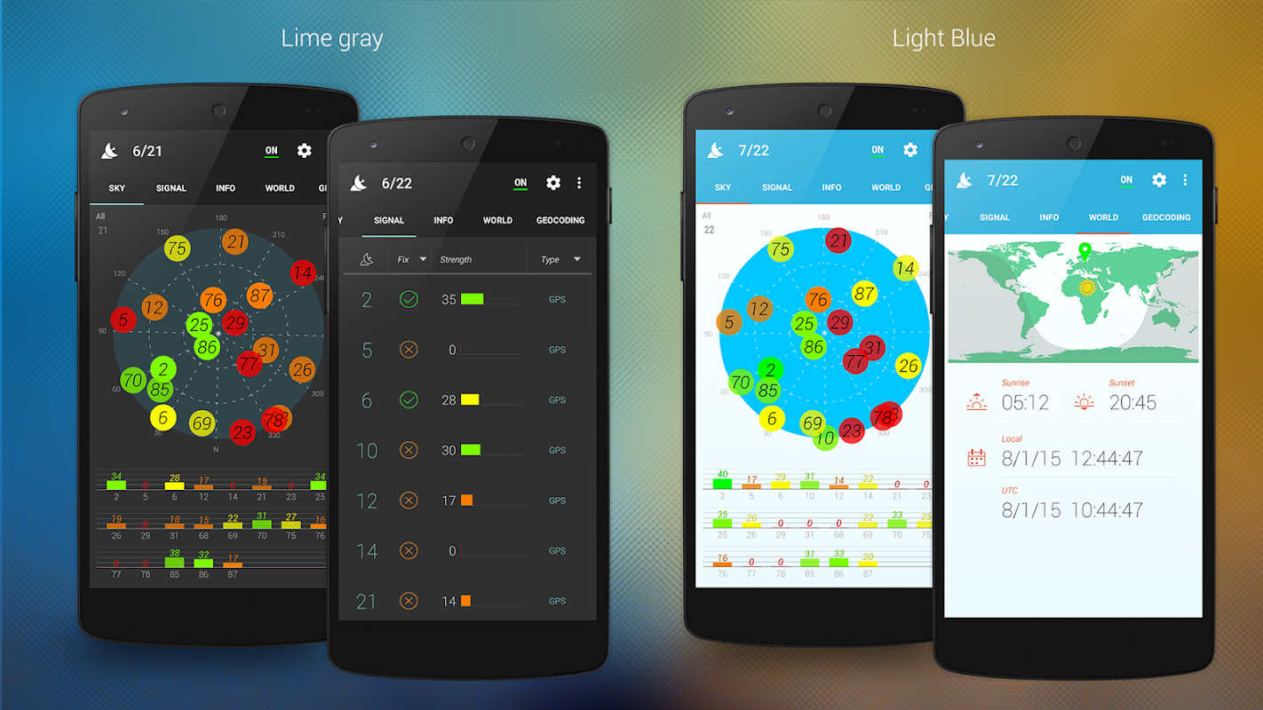 1) زبانه آسمان + نمای سیگنال - نمای آسمان نقشه موقعیت ماهواره های متصل به دستگاه را در آسمان نشان می دهد. هر دایره کوچک نشان دهنده یک ماهواره با رنگ مناسب برای قدرت سیگنال و وضعیت GPS است. نمای قدرت سیگنال نمودار قدرت ماهواره های متصل به دستگاه را نشان می دهد. هر میله یک ماهواره است ، ارتفاع میله متناسب با قدرت سیگنال دریافت شده است.