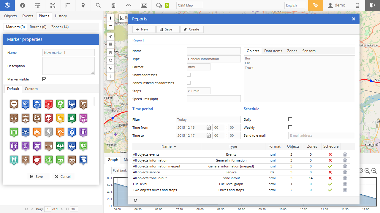 - سرور می تواند اعلان ها را از طریق ایمیل برای شما تولید و ارسال کند یا در صورت وقوع اتفاقی با یک پنجره بازشو اطلاع دهد. این نوع وقایع ممکن است زمانی باشد که جسم وارد یا خارج از منطقه geofence شود، محدودیت سرعت را نقض کند، دکمه SOS را فشار دهد، دستگاه GPS اتصال را قطع کند و حتی موتور را روشن کند یا در را باز کند.