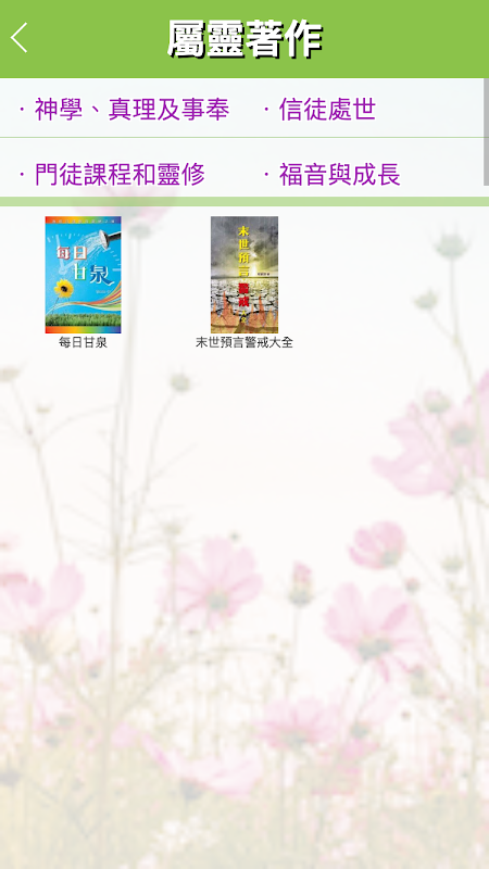 این کتابخانه که توسط Elder Cheng Meng'en مجوز داده شده است، حاوی کتاب های معنوی است که توسط بزرگان نوشته شده است، که بسیاری از آنها پرفروش ترین در بین مؤمنان هستند. کتابهای الکترونیکی زیر یکی یکی اضافه میشوند، از جمله: