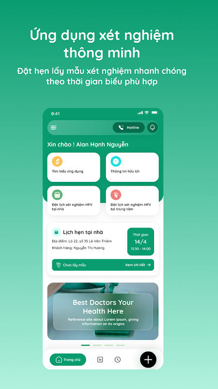 GreenLab یک برنامه پزشکی هوشمند از سیستم مرکز تست آزمایشگاه سبز با پلتفرم فناوری مدرن، ویژگیهای بهروزرسانی و بهینهسازی شده است. این برنامه تجربیات راحت را با ویژگی های برجسته برای مشتریان به ارمغان می آورد: رزرو قرار آنلاین، مدیریت قرار، ردیابی دقیق سفر نمونه، دریافت و مدیریت نتایج آزمون، مدیریت رکورد سوابق تست برای کل خانواده، یافتن اطلاعات مربوط به شاخص های آزمون.