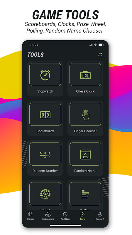 همچنین "" ابزار بازی "" شامل مواردی مانند تابلوی جدول ، ساعت متوقف ، چرخ جایزه ، نام تصادفی و انتخاب کننده شماره و موارد دیگر است.
