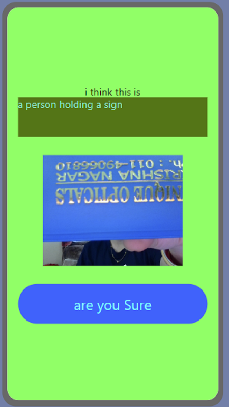 برنامه یک عکس می گیرد و شرحی از آنچه فکر می کند تصویر است ارائه می دهد. شما باید تصمیم بگیرید که آیا بیانیه درست است یا خیر.
