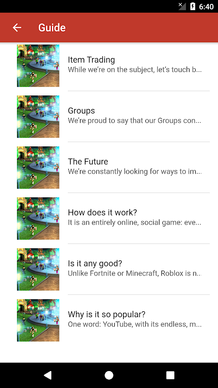 - This application contains a guide to play this game which consists of several tips and tricks to simplify the lovers of this game to complete each mission in the game.contain Guide for the game "Roblox"