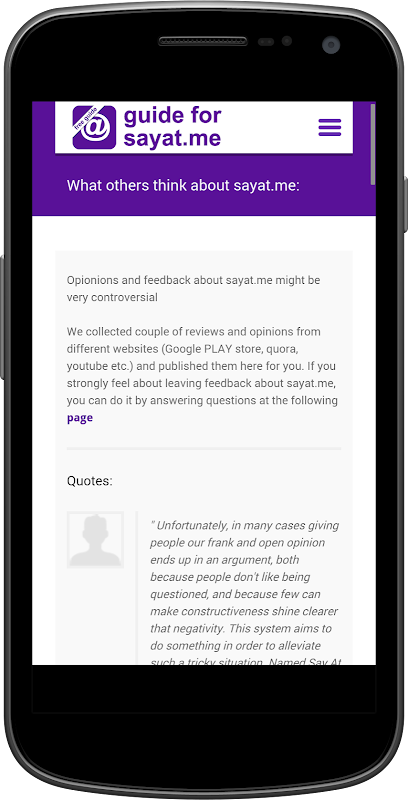 اگر مطمئن نیستید Sayat.Me چیست، ادامه مطلب را بخوانید. در یک جمله sayat.me یک وب سرویس است که به شما اجازه می دهد نظرات دیگران را در مورد خودتان جمع آوری کنید. علاوه بر این، همه پاسخ ها ناشناس هستند، بنابراین بازخورد کاملاً صادقانه و صادقانه از دوستان، دشمنان، شرکای تجاری، والدین یا عاشقان شما امکان پذیر است.