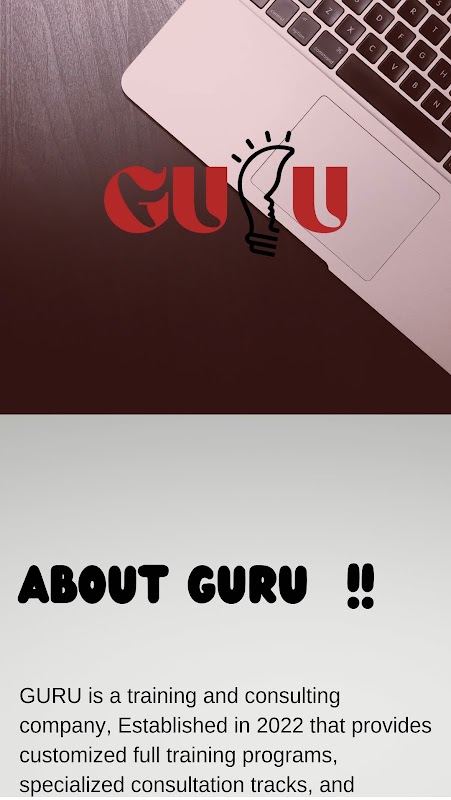 GURU یک شرکت آموزشی و مشاوره ای است که در سال 2022 تأسیس شده است که برنامه های آموزشی کامل سفارشی، مسیرهای مشاوره تخصصی و جلسات مربیگری را برای مطابقت با نیازهای هر مشتری و جذب مشتری ارائه می دهد.