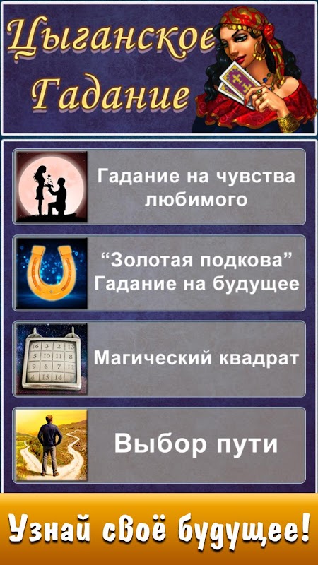 The application contains several types of gypsy fortune-telling - guessing on the feelings of a loved one, guessing for the future, guessing on relationships and choosing a path.