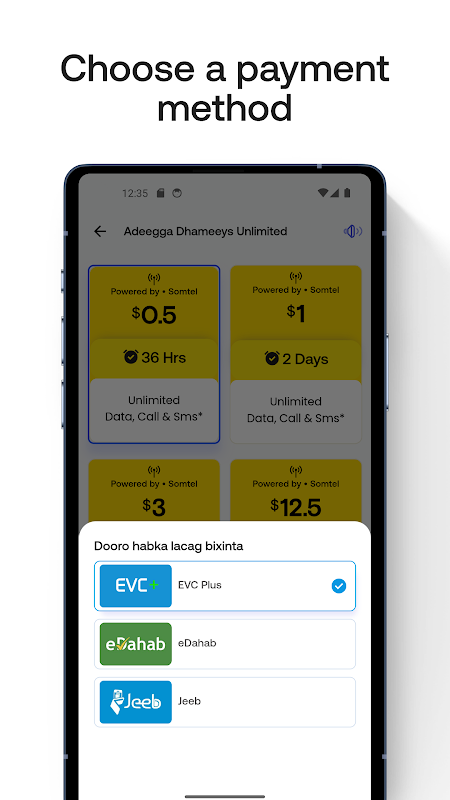 به راحتی بسته های داده سیم کارت را از Hormuud، Somtel و Somnet دریافت کنید.