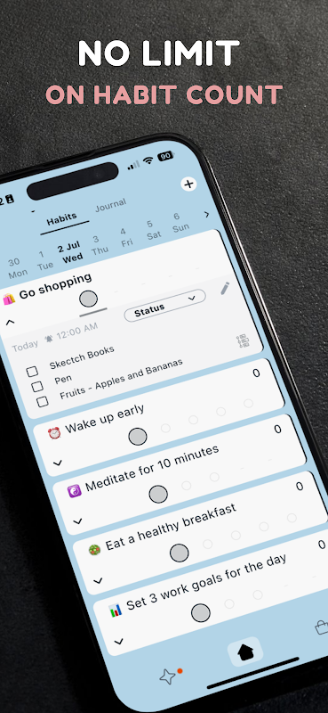 * ردیاب عادت روزهای منعطف: ردیاب فعالیت برای روزهای انعطاف پذیر در هفته یا ماه. لیست کارهایی را ایجاد کنید و یادآورهایی را برای رسیدن به اهداف زندگی تنظیم کنید.
