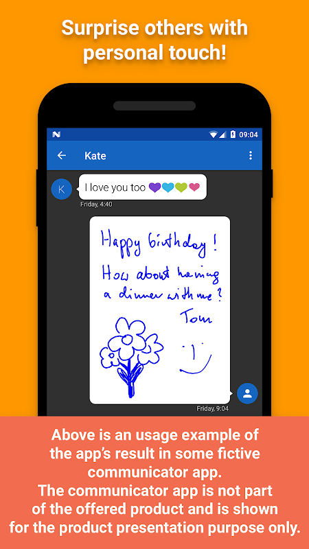 تعجب دوستان خود را با پیام های اصلی، منحصر به فرد و شخصا دست نویس. ارسال این اس ام اس (MMS)، مسنجر، رسانه های اجتماعی و یا برنامه ایمیل شما ترجیح می دهید، با استفاده از این ابزار فوق العاده. نوشتن یک متن، قرعه کشی یک طرح، یک قطعه از هنر و یا ایجاد هر چه دوست دارید.