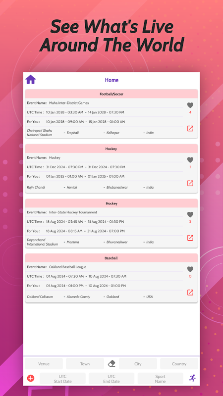 رابط کاربر پسند ما، پیمایش و کشف رویدادهای هیجان انگیز را آسان می کند. Hapning یک تجربه کاربری یکپارچه را ارائه می دهد و تضمین می کند که می توانید بدون زحمت از رویدادهای زنده در هر کجا که هستید مطلع شوید.