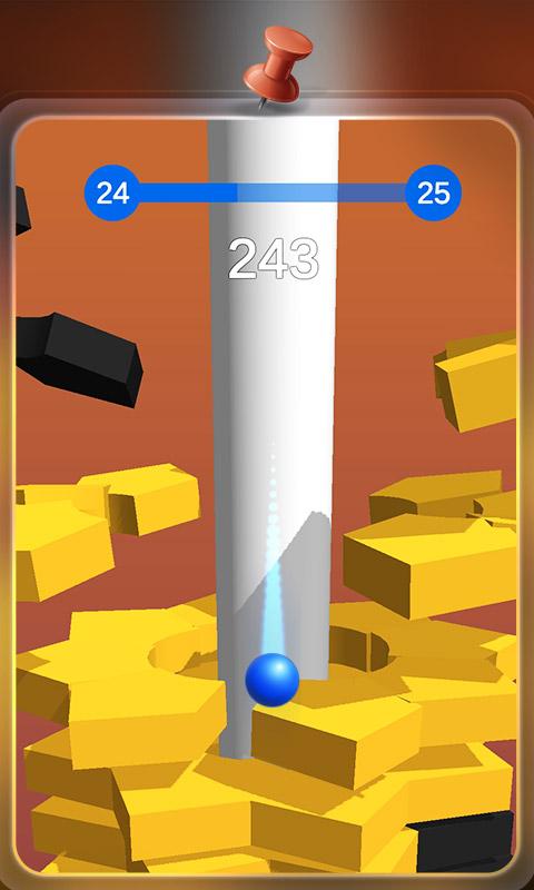 Your ball smashes like a brick through colorful platforms that block its descent, but if you hit a black one, it's all over! Your ball shatters to pieces and you have to start your fall all over again.
