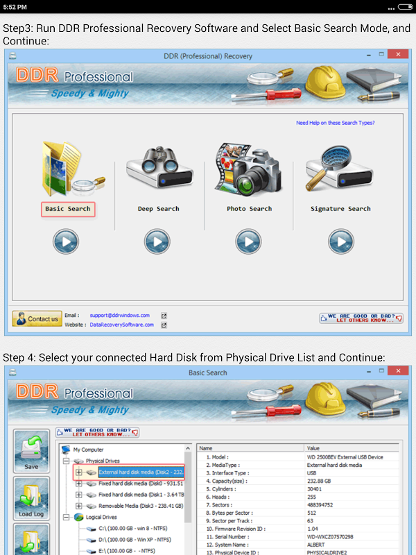 Hard Disk Drive Recovery Help is a free Adviser App to help users who are trying to recover data from crashed Computer hard drives such as Laptop Desktop External Hard disks and USB Flash Drive of Windows as well as Mac using DDR Data Recovery Software. App has following basic Data recovery categories on the basis of primary data loss cases: