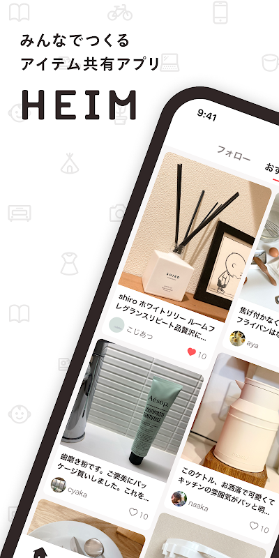 HEIM is a shopping log app. You can create your own monolist or use it as a mono SNS just by posting your favorite items.