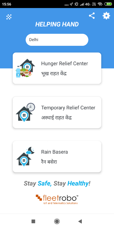 Helping Hand is a mobile application developed by the FleetRobo to locate essential services like Hunger Relief Centers, Temporary Relief Centers and Rain Baseras.