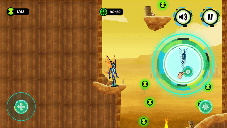 alien hero may transform into five superheroes during the game. However, in the beginning, you can only play as Canonbo. With every level that you manage to complete, you will also unlock the other heroes.