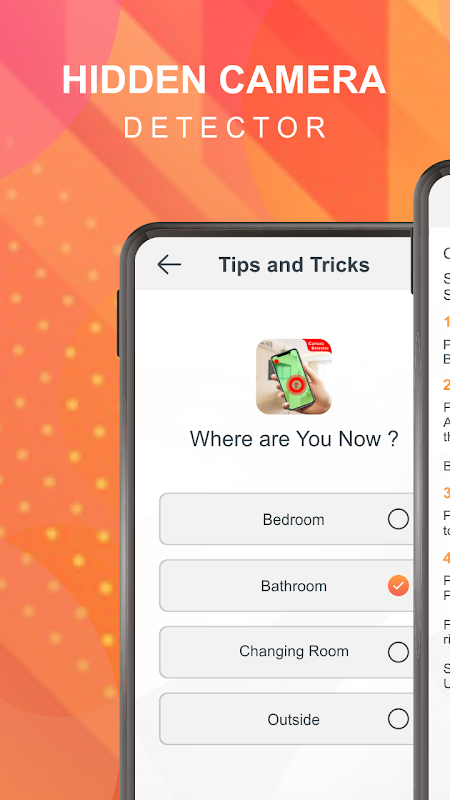 Hidden Camera Finder - Spy Camera Detector is an app that can solve privacy problems, while you are in changing room, public toilet, or any place where you think, nobody is watching you. In the modern world, bad guys are using modern technologies to fulfill their filthy desires and want to earn cash from your private videos and photos. by using this simulator to detect hidden cameras and microphones you can easily detect potential hidden cameras and microphones. it is also a surveillance device detector which is used to detect potential camera microphones bug.