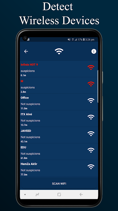 اپلیکیشن آشکارساز دستگاه های مخفی به راحتی دستگاه های مخفی مانند دوربین و میکروفون را شناسایی می کند. اپلیکیشن ردیاب و تشخیص ردیاب مخفی اندروید به کاربر این امکان را میدهد که دستگاههای مخفی را فقط با استفاده از تلفن اندرویدی شناسایی کند. برنامه یاب دستگاه های مخفی حرفه ای ترین برنامه ردیاب دوربین مخفی مخفی است که به شما کمک می کند حریم خصوصی و فیلم ها و تصاویر شخصی خود را ایمن کنید. بنابراین فقط برنامه دستگاه های مخفی رایگان ما را نصب کنید و در جایی که شک دارید روی دکمه اسکن ضربه بزنید. برنامه آشکارساز دستگاه های مخفی برای شما بسیار مهم است، بنابراین قبل از خواب در هر هتلی اسکن کنید.