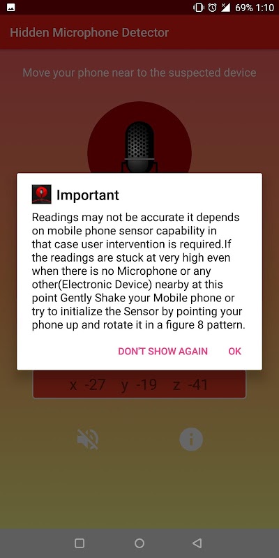 استفاده از اپلیکیشن Hidden Microphone Detector آسان است، کافی است اپلیکیشن Microphone Detector را باز کنید و آن را در اطراف اشیاء مشکوک حرکت دهید. اگر مقادیر میدان مغناطیسی ایجاد شود، باید میکروفون یا دوربین های مخفی در منطقه اطراف شما وجود داشته باشد. شما به راحتی می توانید با این آشکارساز اشکال را اسکن و تشخیص دهید. دقت برنامه کاملاً به سنسور مغناطیسی دستگاه شما بستگی دارد و تحت تأثیر قرار می گیرد. دستگاه های الکترونیکی مانند تلویزیون، ریموت، باتری در اثر امواج الکترومغناطیسی.