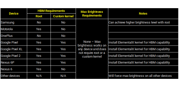 HBM به تلفنهای Nexus 6 / 6P، Pixel، Pixel XL، Pixel 2 و Motorola نیاز دارد. ریشه لازم است زیرا HBM یک تنظیم سخت افزاری ویژه است ، این کار به سادگی کشویی روشنایی شما را به حداکثر نمی رساند. این به طور قابل توجهی روشن تر از حداکثر روشنایی در دستگاه های سازگار است.