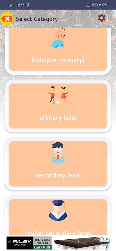 High school quiz is the mobile application targeted for the school student where user from pre-primary level to bachelor level gets the chance to play the quiz based upon different categories and subcategories.This app is designed like a game and looks like a game where user gets chance to interact with the system. Not only that it helps different user to complete different level and many more. One can review and report the questions and get the chance and can also gain coin in each level. One can also use the coin to complete the level.