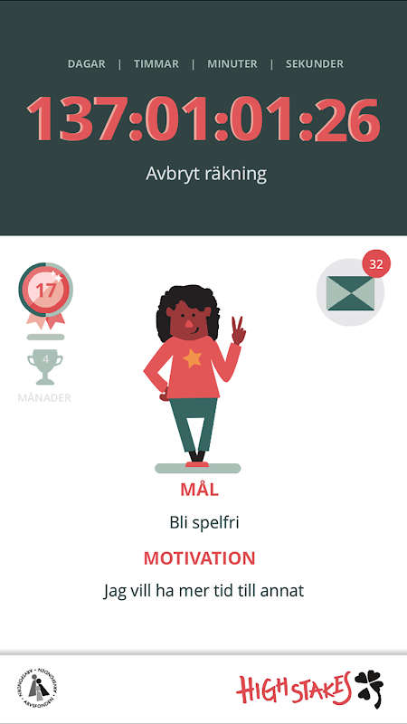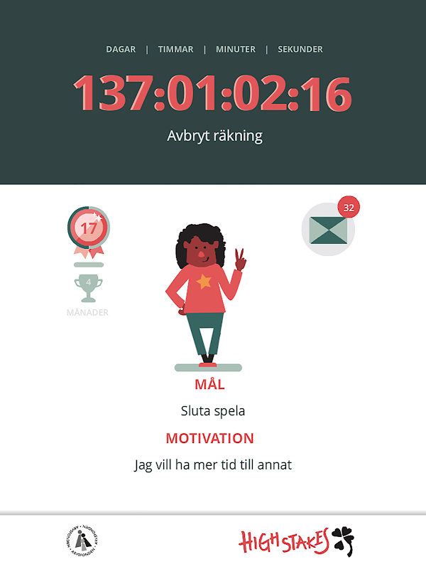Med hjälp av vår klocka kan du hålla koll på hur länge du har varit spelfri. För att hålla motivationen uppe får du meddelande från oss med medaljer för avklarade dagar, pepp, tips, stöd och praktiska verktyg för att hålla dig borta från spelet.