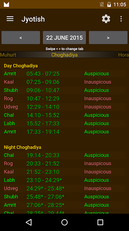 • Muhurt: روز و شب چغادیا، راهوکلام، یاما غانتام، گولی کلام، دور موهورت و ابهیجیت محرتام. همه برای مکان انتخابی شما محاسبه شده است.
