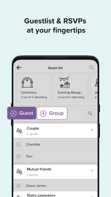 🛠️ ابزارهای برنامهریزی رایگان: با ابزارهای ضروری برنامهریزی ما، برنامهریز عروسی خودتان باشید: برنامهریز بودجه، چکلیست، مدیریت لیست مهمانان، جدول صندلیها، شمارش معکوس روز عروسی و موارد دیگر! فهرست خود را ادغام کنید و لیست هدایای خود را ایجاد کنید.