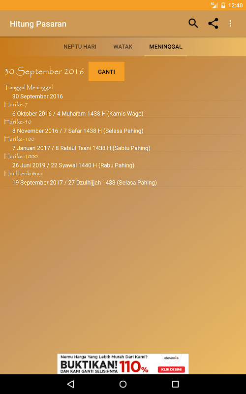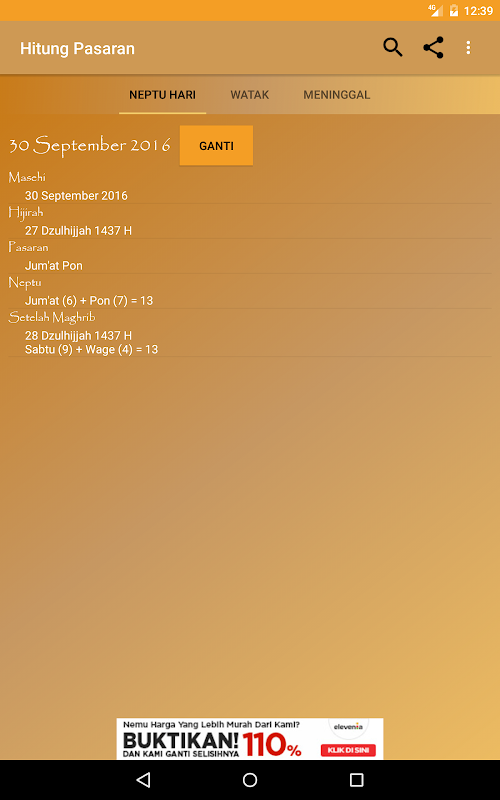 نما Menampilkan هاری دن pasaran pada tanggal tertentu، beserta neptu harinya. Juga menghitung jarak هاری (40، 100، 1000، tahun مسافت INI دن depan tahun) یانگ biasa dimanfaatkan oleh masyarakat جاوا.