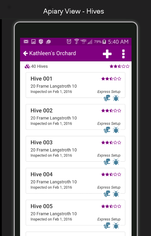 With HiveTool Mobile's Express Setup feature you'll build up your apiary's (bee yard) beehives in seconds, not minutes or hours. Simply create an apiary, specify how many beehives there are and stage beehive configurations in short order. You'll be logging inspections in no time.