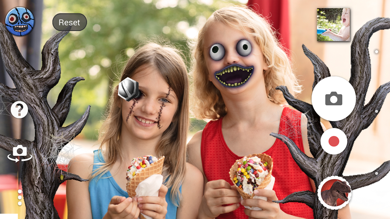 You can add Horror theme content to the Xperia™ AR effect application. With Horror theme you can create fun pictures and movies by attaching scary masks to your friends' faces, and much more. Capture your memories with unique effects. Discover amazing augmented reality scenes in the real world with your viewfinder. Sony's face recognition technology and SmartAR* Engine automatically detect faces and 3D environments and decorate them with fun AR items. Palm recognition** engine detects palms and decorates them.