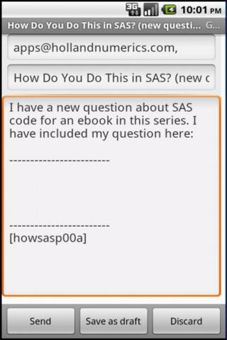 این برنامه، "چگونه شما این کار را در SAS؟"، معرفی رایگان به یک سری از کتابها در مورد SAS برنامه نویسی نرم افزار تمرکز بر پرسش و پاسخ پرسیده می شود، نشان داده شده توسط نمونه کد است که می تواند از طریق ایمیل به طور مستقیم از برنامه فرستاده شده است. مجموعه ای از کتاب های الکترونیکی طراحی شده است به منظور تشویق کاربران به کمک پرسش که برخی از آنها را در نسخه های آینده این برنامه گنجانده شده است. می باشد کنترل برای انتخاب سوالات خاص، حرکت به سوال قبلی یا بعدی، کاهش و یا افزایش فونت به دلخواه کاربر، و ارسال ایمیل درخواست برای پاسخ به سوالات در عین حال در این نسخه از کتاب شامل نمی شود وجود دارد.