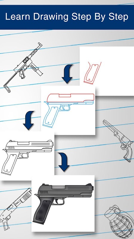 Learn How to Draw Weapons is an app that teaches you how to drawn Weapon pictures step by step.