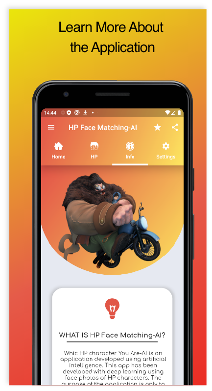 من خبر بسیار خوبی برای شما دارم با تشکر از برنامه ما که با آموزش شبکه عمیق یادگیری توسعه یافته است ، می توانید شخصیت HP را که شباهت دارید ، ببینید. تنها کاری که شما باید انجام دهید این است که برنامه را بارگیری کنید و از گالری یا دوربین خود عکس انتخاب کنید. سپس برنامه به شما نشان می دهد که به کدام شخصیت HP شبیه هستید.