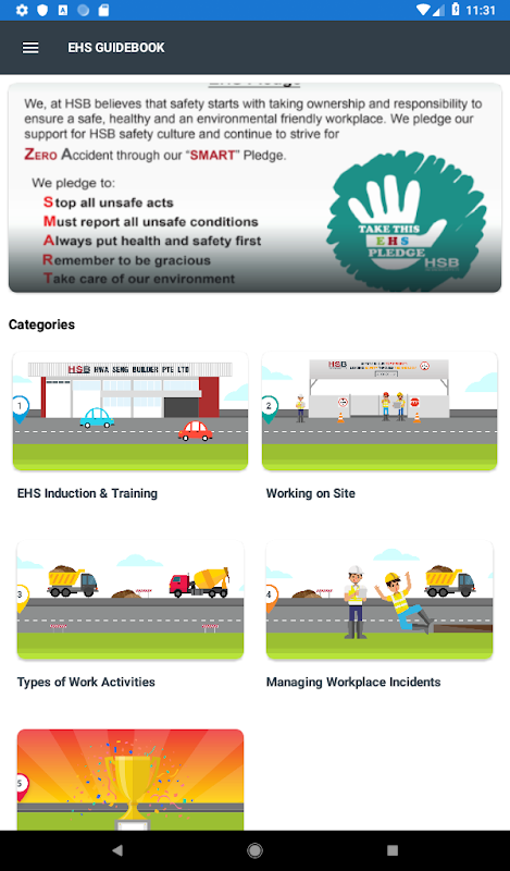 HSB EHS Guidebook Application یک برنامه آموزشی و تعاملی است که برای ارائه دانش و آموزش EHS برای کارمندان Hwa Seng Builder Pte Ltd سفارشی شده است