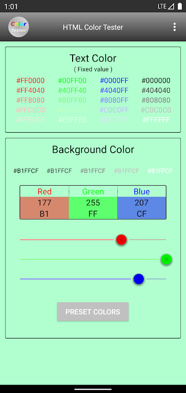 با نوار جستجو (قرمز، سبز، آبی) که از کد رنگ کد پشتیبانی می کند، می توانید رنگ پسزمینه این برنامه را آزادانه تغییر دهید. همچنین می توانید از دکمه PRESET COLORS برای تغییر رنگ پس زمینه از پیش تعیین شده با یک لمس استفاده کنید.