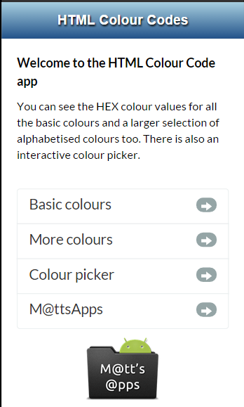 It's a simple app to view the HEX values of colours for HTML and CSS development.